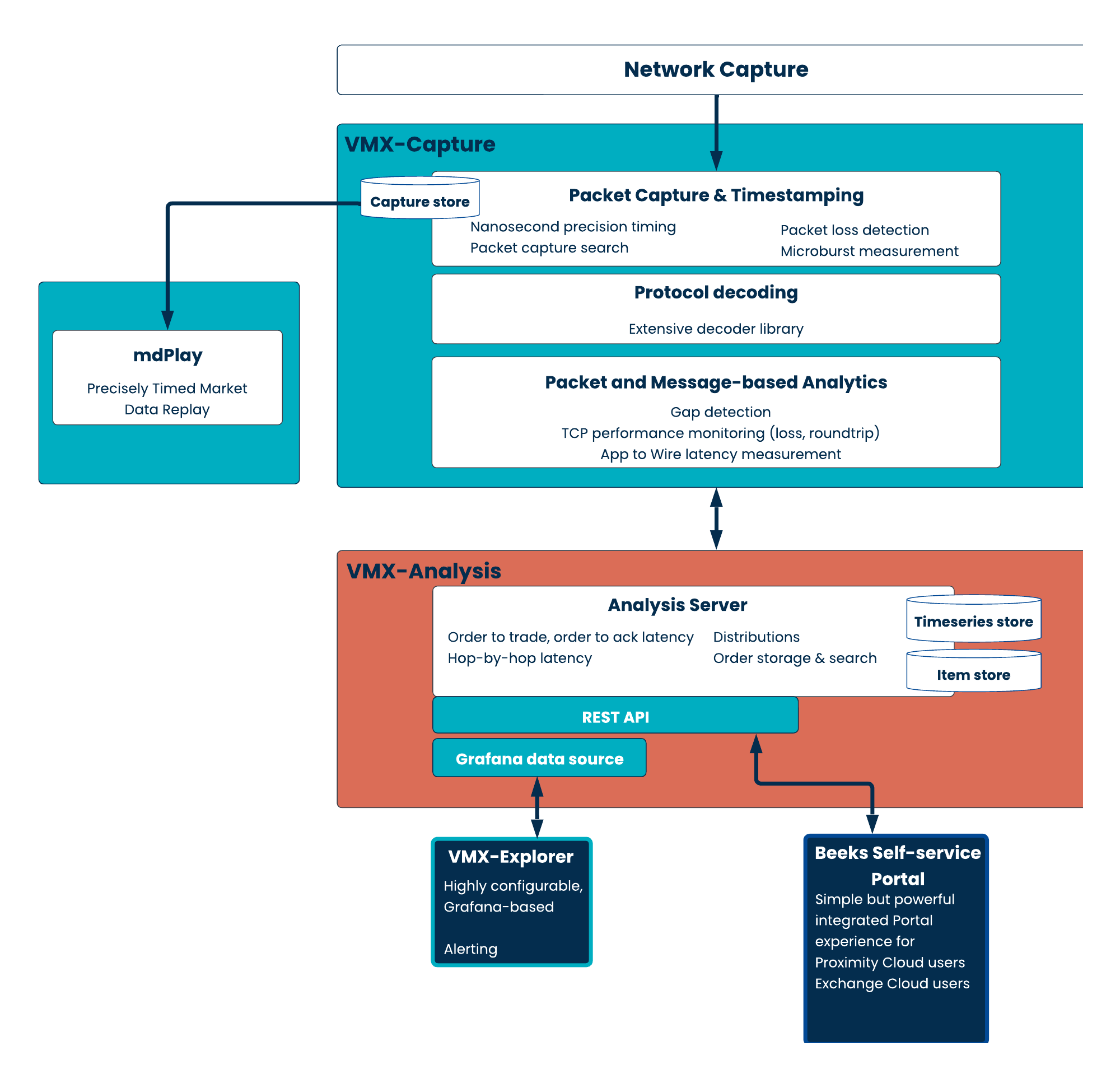 Built around the core VMX-Capture component of the Beeks Analytics architecture, Beeks Market Data Packet Capture Services uses a series of Beeks solutions including mdArchiver, mdSeed, mdVault, and mdPortal.