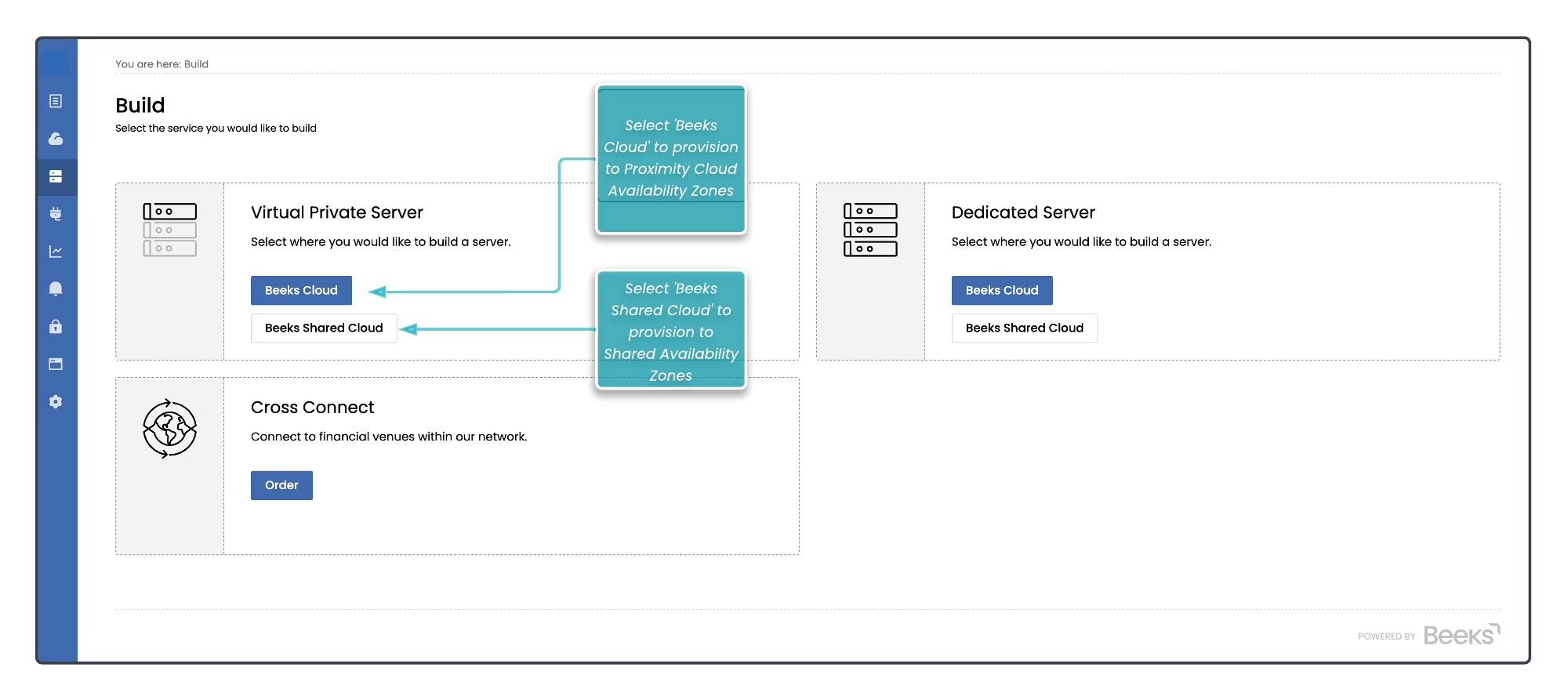 In the example below, select the button Beeks Cloud to provision a Virtual Private Server or Dedicated Server on a Proximity Cloud Availability Zone, and select the button Beeks Shared Cloud to provision on a Shared Availability Zone.