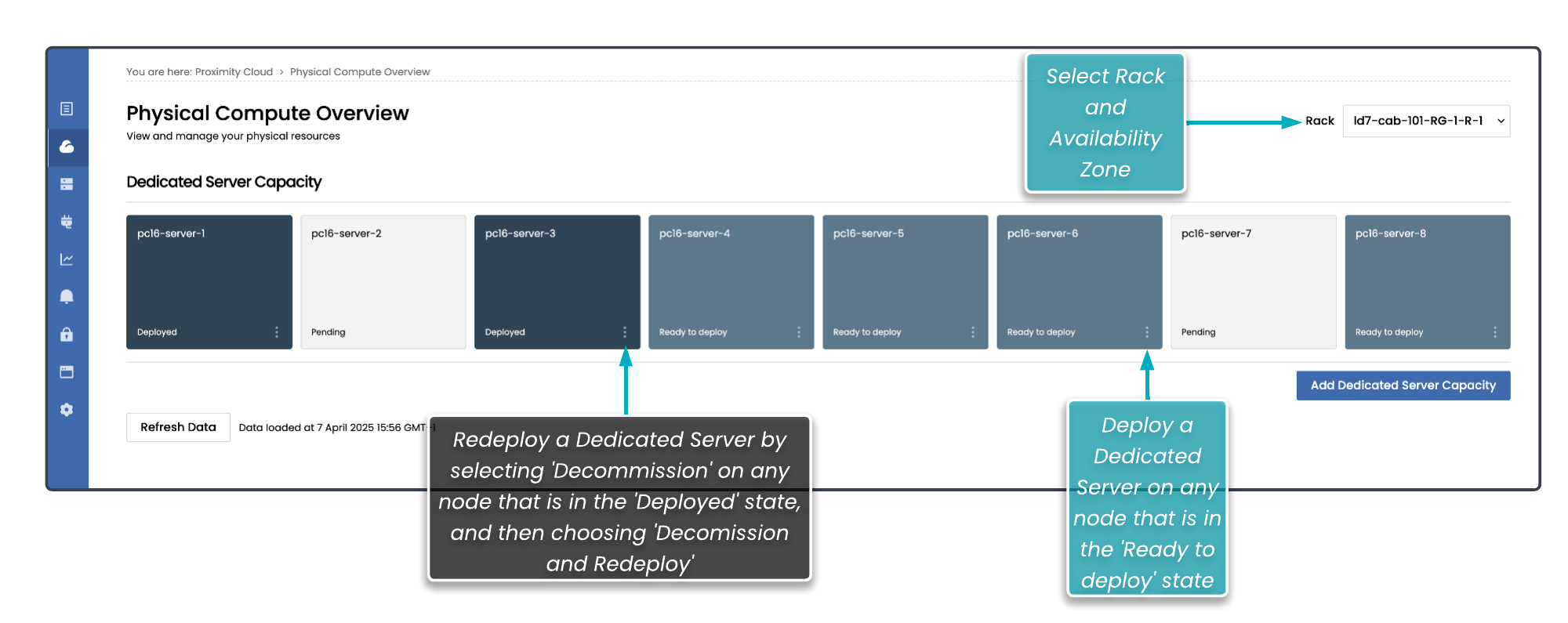 The Physical Compute Overview page shows you the available capacity in any given Proximity Cloud rack.