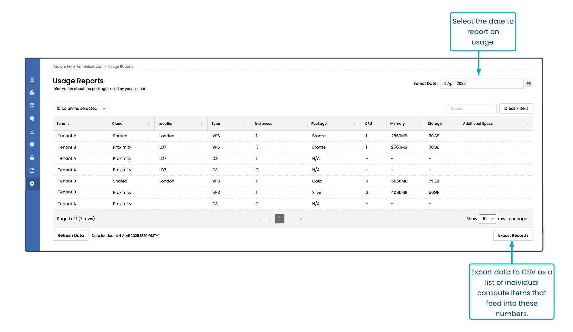 Administrators in the parent portal can go to Administration > Usage Reports to see an overview of the utilisation of resources across all of their tenant portals (as well as on their own portals) on any given date. This is useful for capacity management, billing/invoicing purposes, and support.