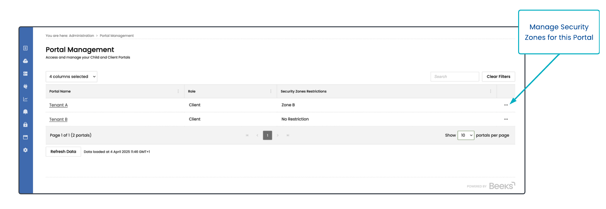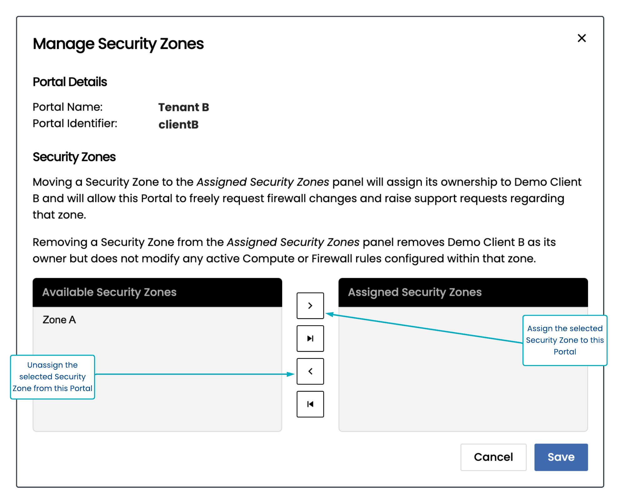 Select the More actions (three dots) icon in the row for a portal to open the Manage Security Zones modal window. This allows you to associate a Security Zone with a portal, and enables you to easily learn the intended purpose of a network to reduce the risk of you assigning compute to the wrong network. Further restrictions will be introduced in future in the portal, which will enforce these restrictions when, for example, deploying new compute.