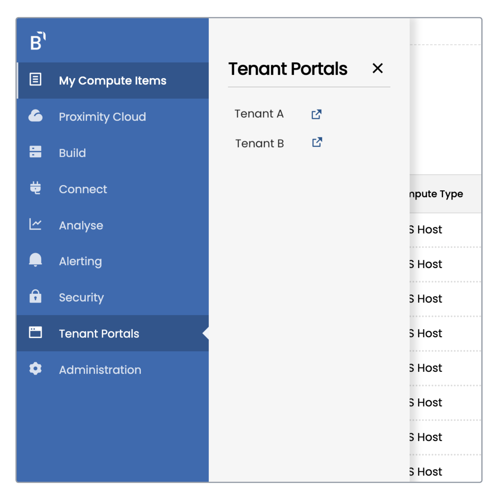 The Portal also supports the setup of a client portal. This is a special type of tenant portal that has the order options disabled for all of its users. It is useful if you are a large organisation and you want to configure certain suborganisations with a view of certain compute items.