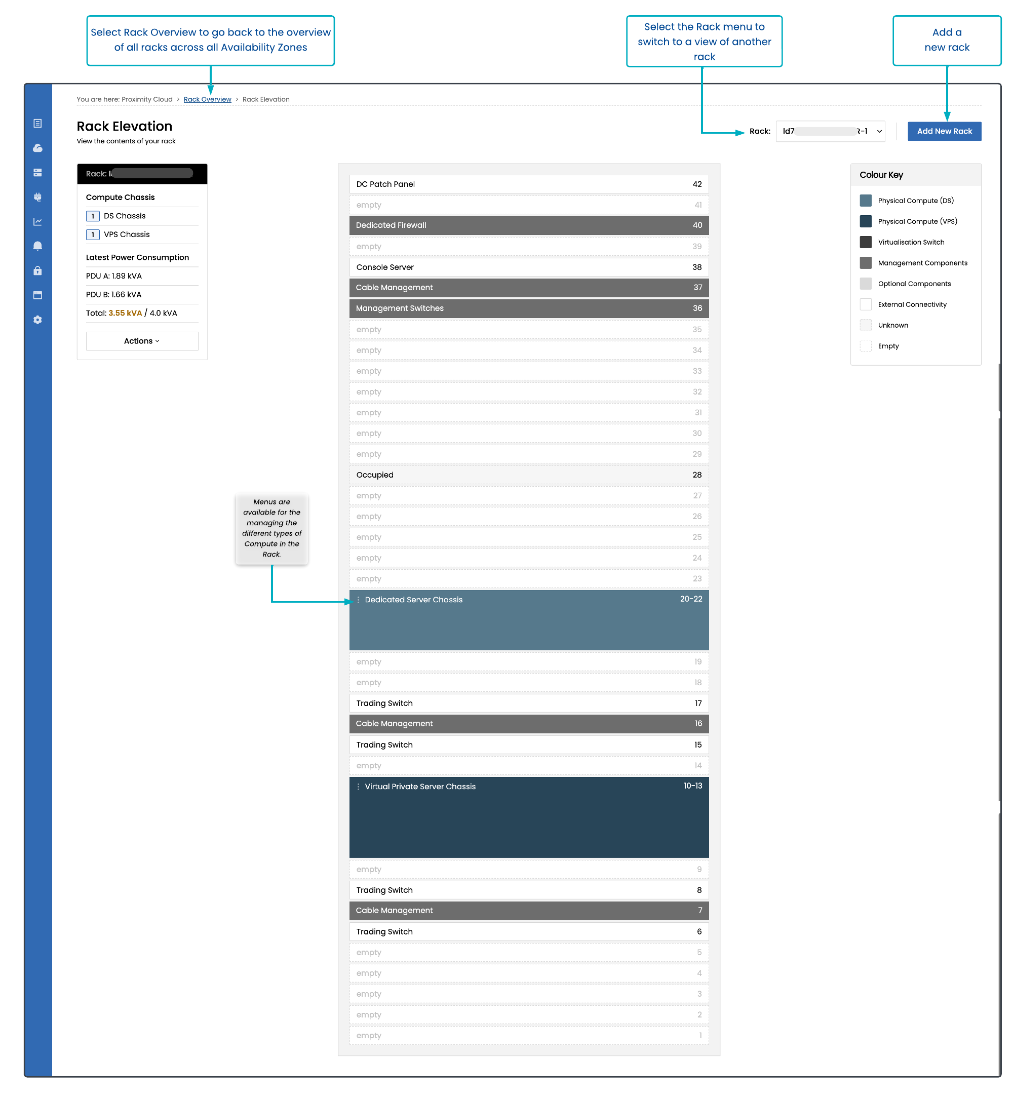 Select the Actions button in the tile for a rack to display the Rack Elevation, which is a visual representation of all of the physical infrastructure within your Proximity Cloud racks. The page enables you to see at-a-glance which physical compute, switches, and connectivity are housed on each chassis, and view where compute you’ve ordered will be located once deployed.