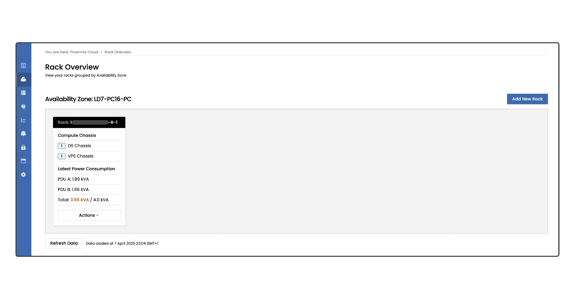 The Proximity Cloud > Rack Overview summarises your Proximity Cloud racks, which are each grouped by Availability Zone. Use this page to quickly get an overview of the DS chassis and VPS chassis across your entire global estate.
