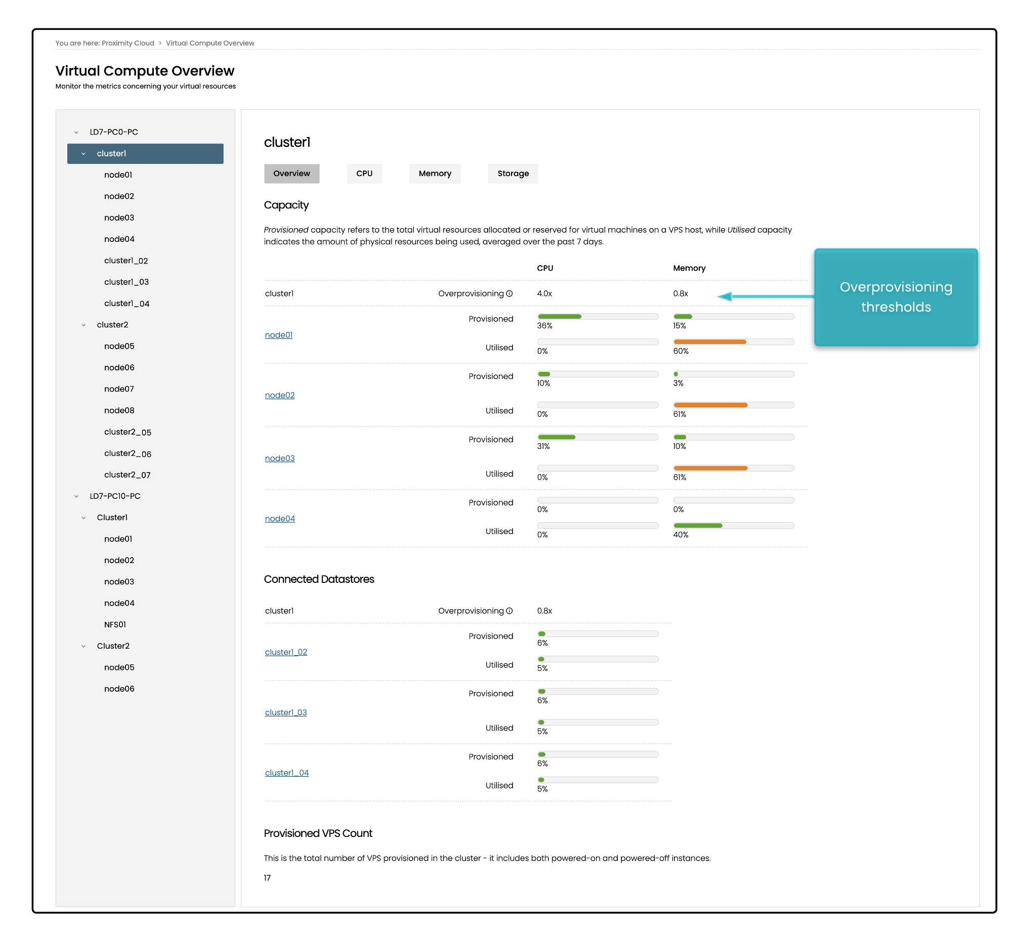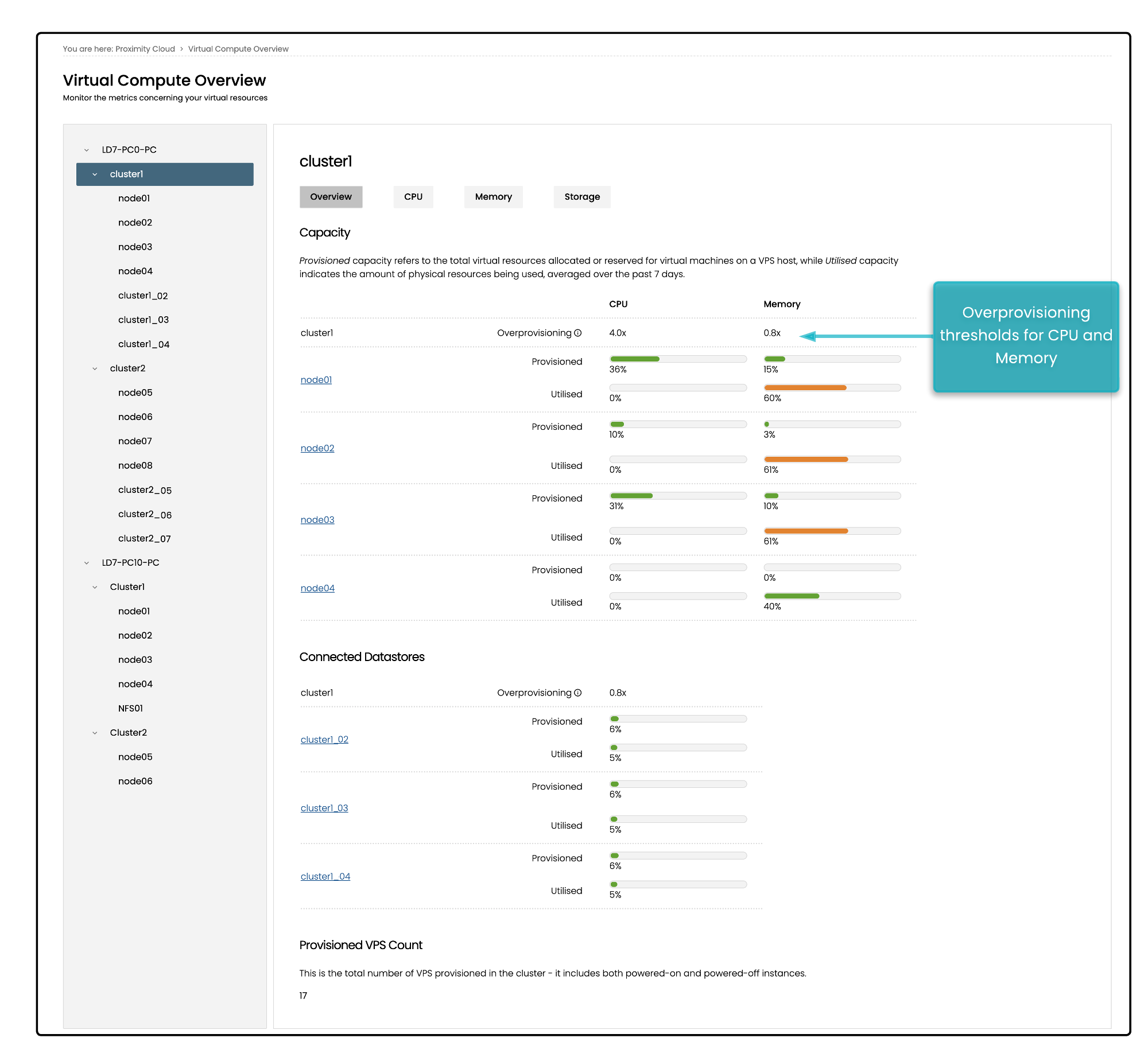 During deployment, Beeks sets a maximum allocation for overprovisioning of CPU and memory. This is displayed in the Overview tab in the Proximity Cloud > Virtual Compute Overview page.