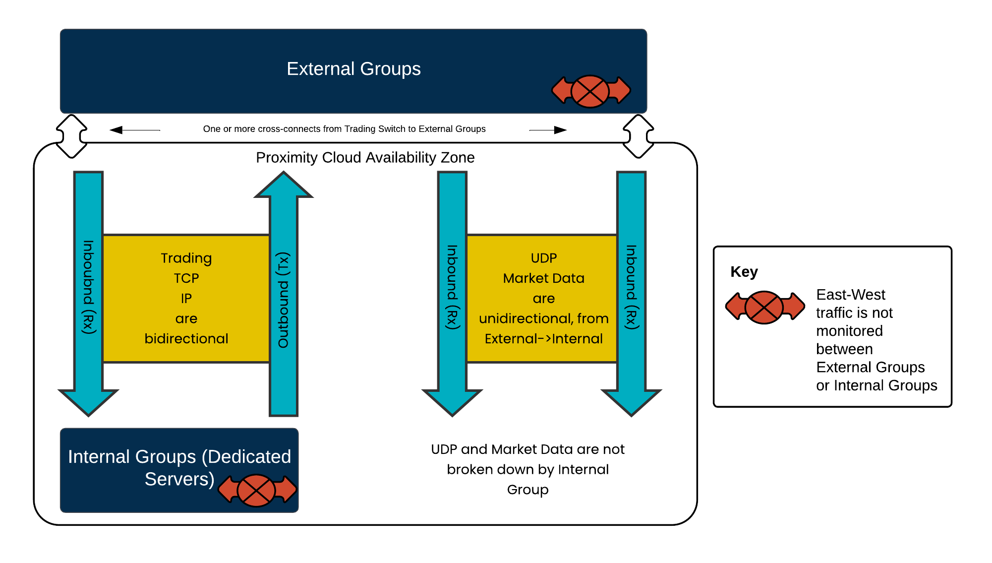Note that for multicast market data, we cannot capture exactly which Dedicated Servers are receiving this data. As a result, Market Data metrics are only broken down by External Group. UDP statistics are treated the same way as the majority of UDP in a trading environment is often multicast traffic. Market Data and UDP metrics cannot be broken down by Internal Group.