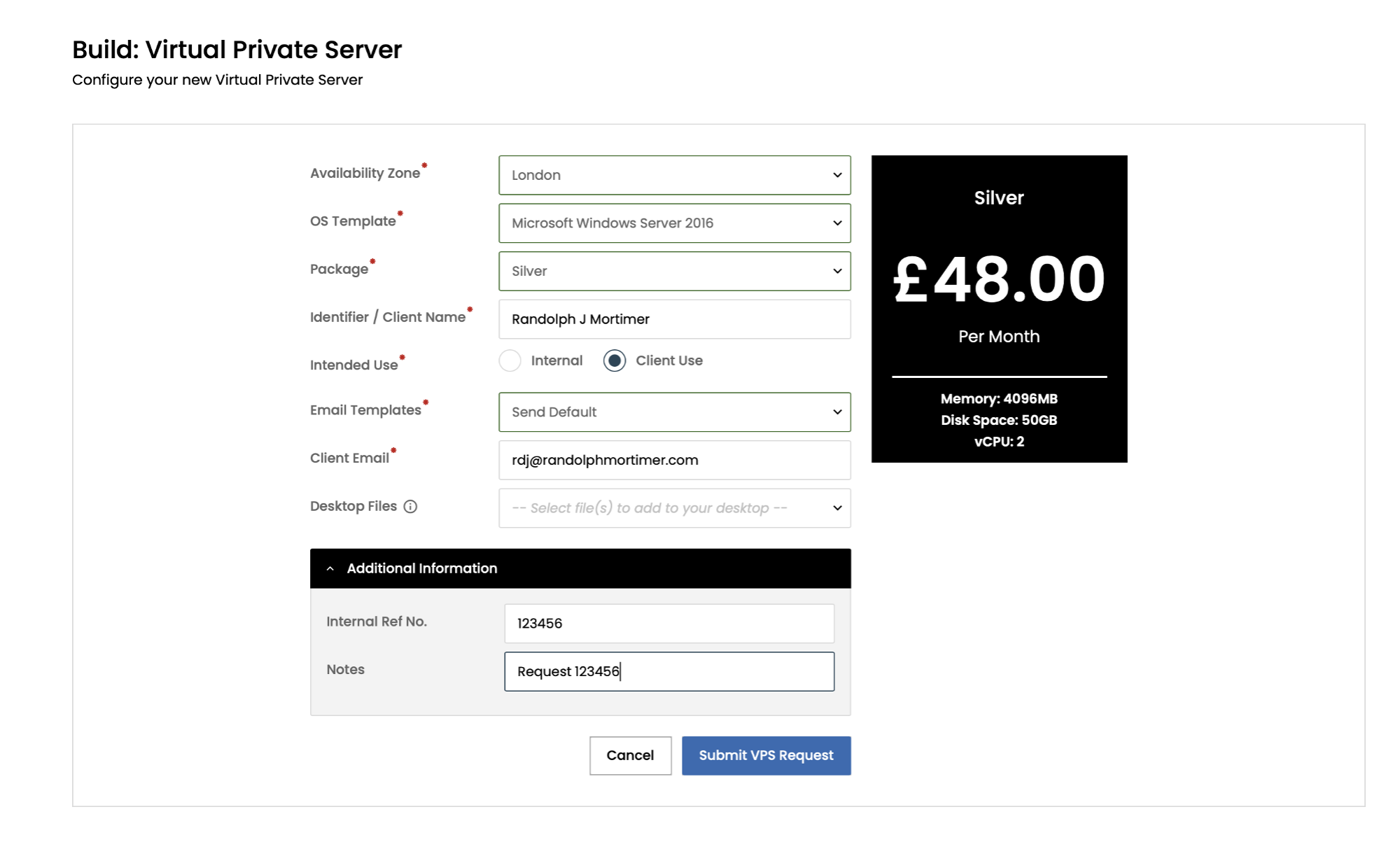 Client Email * (required if the Send Default option is selected in the Email Template field) | Intended Use = ‘Client Use’ (the default is ‘Internal’) | Optional. Enter the email address of an external client who is not a registered Portal user i.e. a client of yours who you wish to receive credentials for the completed Virtual Private Server. If the field is left blank then the Welcome email will be sent to the build requestor only. The user who submitted the build request is notified by email. All Admins are cc'ed on this email. |