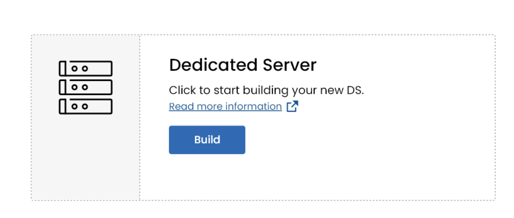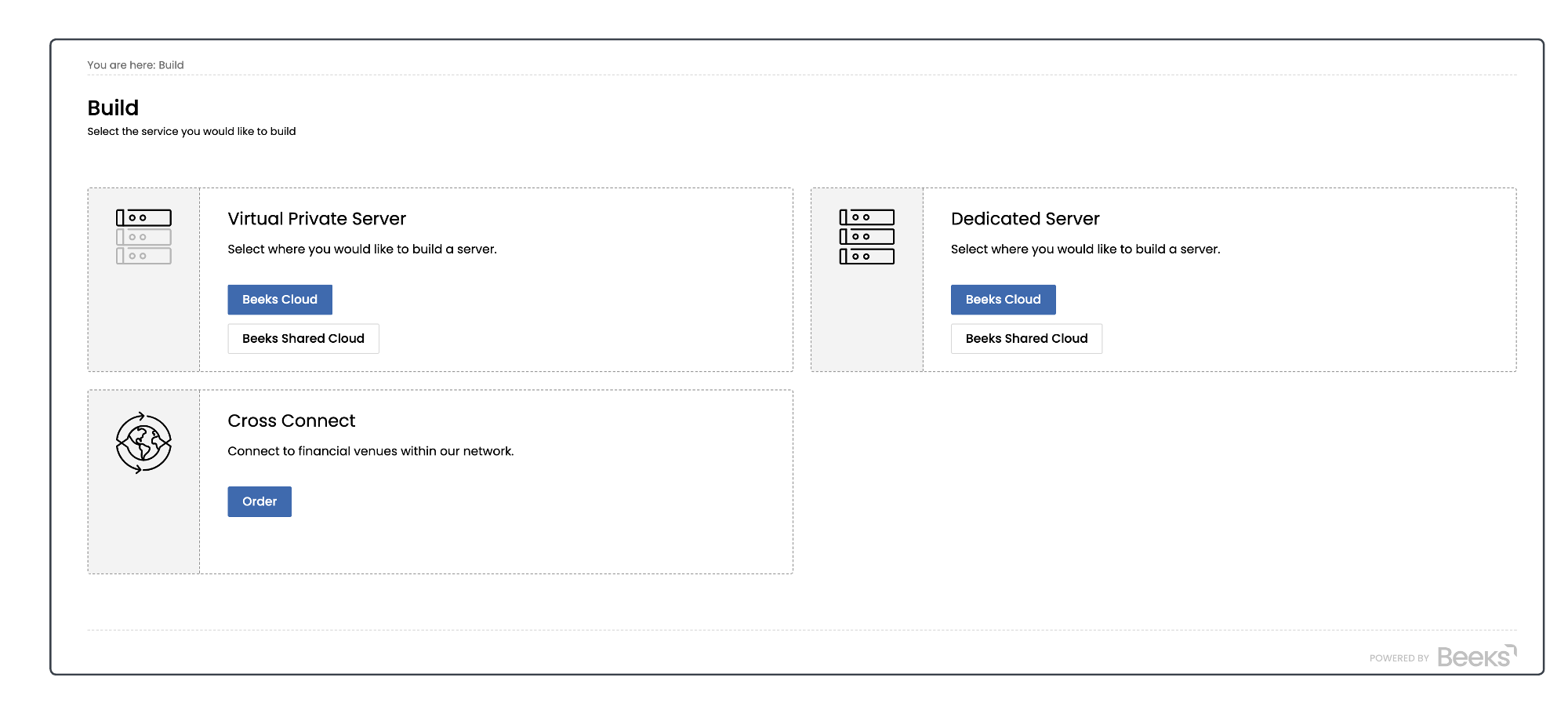 The VPS and DS tiles have a Build button (an Order button for the Cross Connect tile) that you’ll select to order that type of compute.