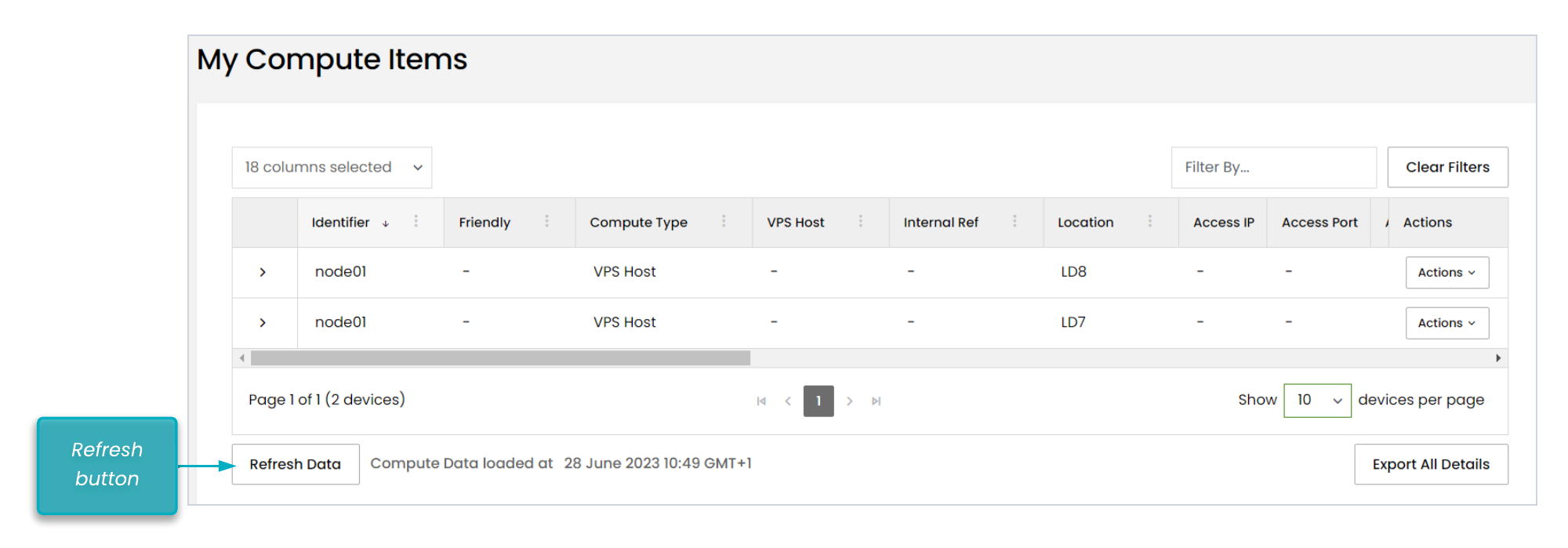 To get the latest information about your Compute Items, select the Refresh Data button to refresh the table. The text beside it will update to indicate the time at which the grid was refreshed.