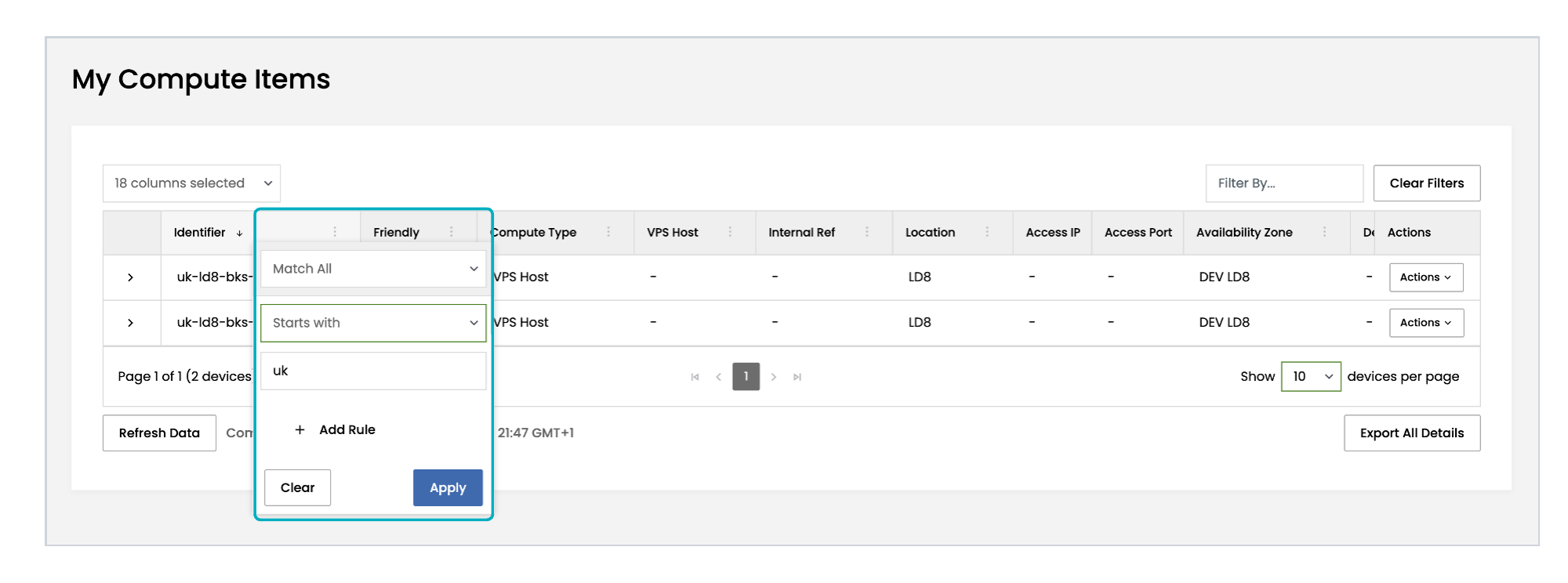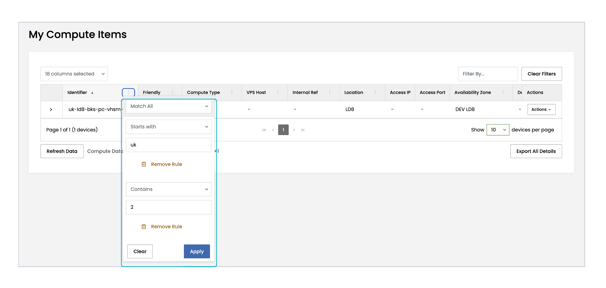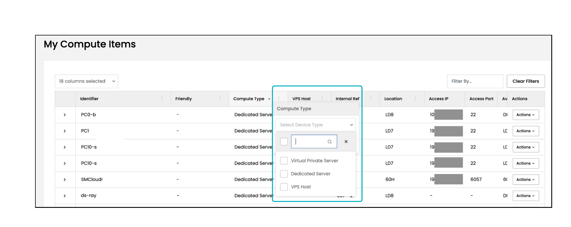 To filter the list to display only the Compute Items you want to view, select the Filter icon in the column header. Depending on the column, you will see either a checkbox list or a free text box. As you type into the text box, the list of compute in the grid will automatically update to match the filters.