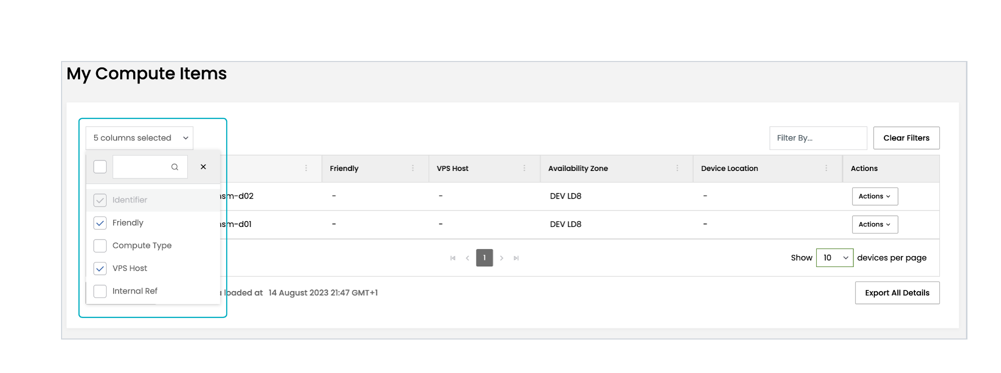 To display or hide columns in the grid, select the Columns Selected menu below the My Compute Items title. This displays a list of columns each with an accompanying checkbox. Columns with a tick are displayed in the grid. Select a checkbox to add or remove the tick. If a column in the list is greyed out, it can’t be hidden.