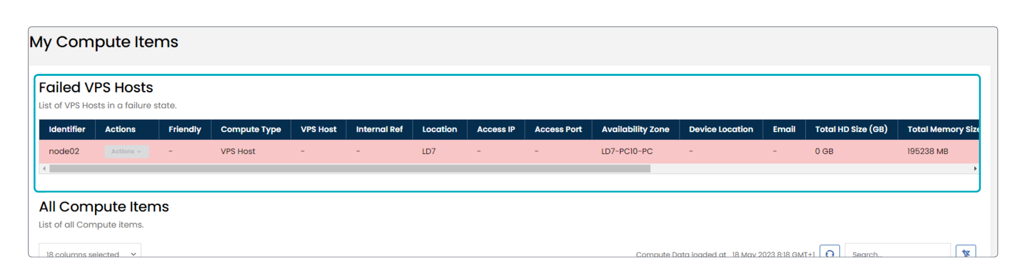 In the event that one of the VPS Hosts in your compute items has a failed server status, it is also displayed in a Failed VPS Host data grid that sits above the All Compute Items grid to alert you to this issue. The Failed VPS Host data grid is displayed only if there are one or more Failed VPS Hosts.