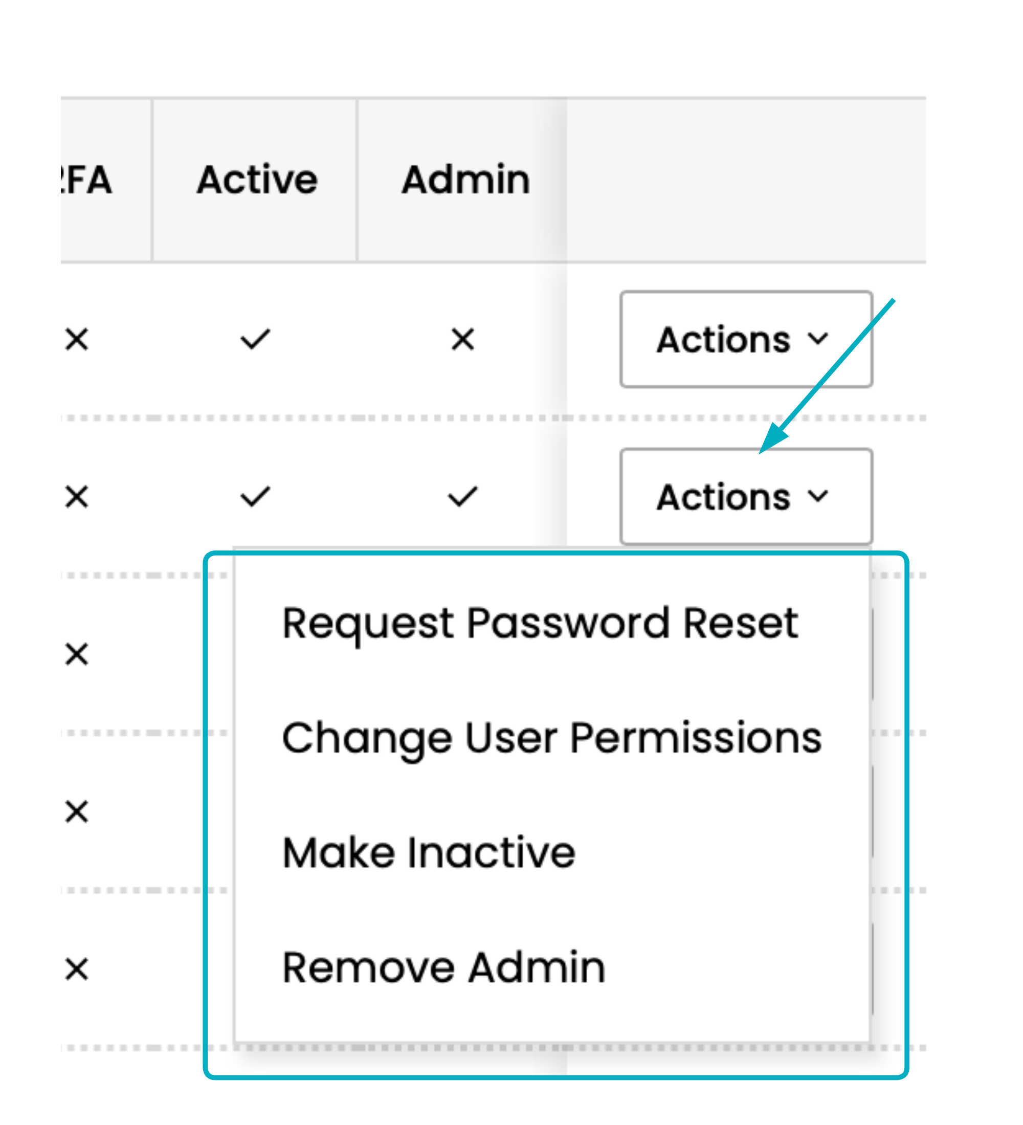 As an Administrator, you can select the Actions button for a user, and perform actions such as: