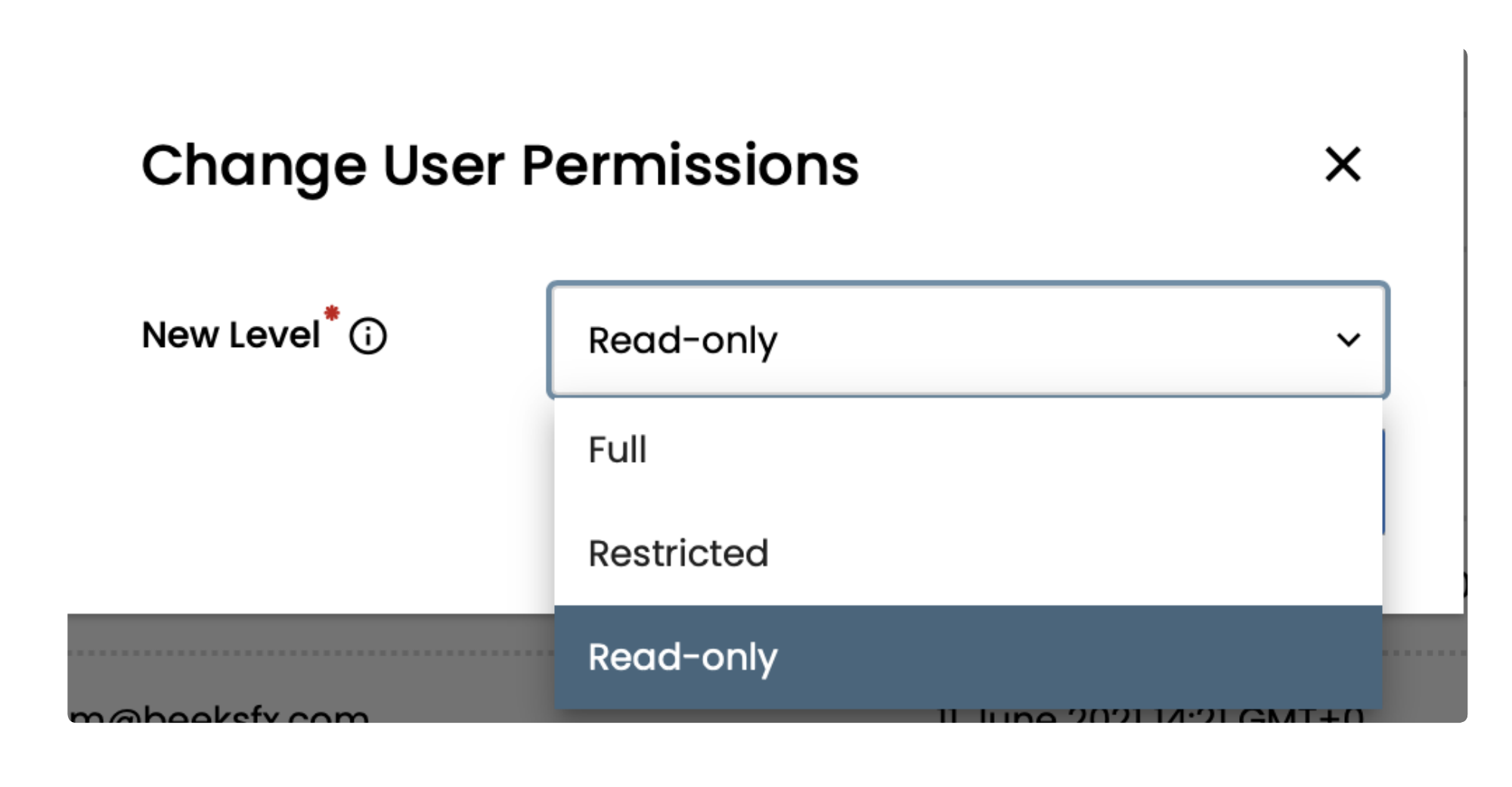 Opens a modal that allows you to select Full, Restricted, or Read Only. See below for details of these permissions.Make Inactive