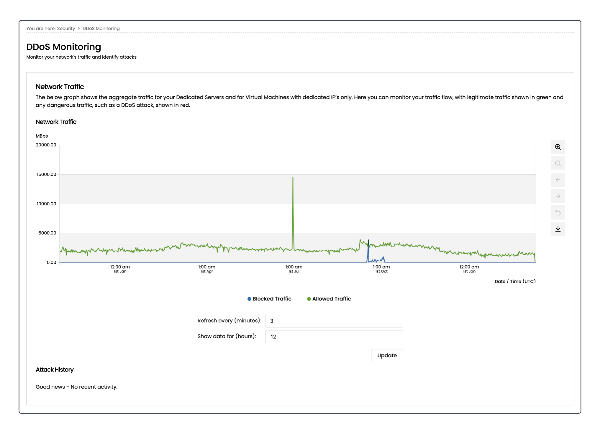 Select Security > DDoS Monitoring in the main menu to open a visualisation of your traffic flow through DDoS monitoring devices (if you consume this service). You can change the refresh rate and time period, as well as zoom into the graph and download an image of the graph.