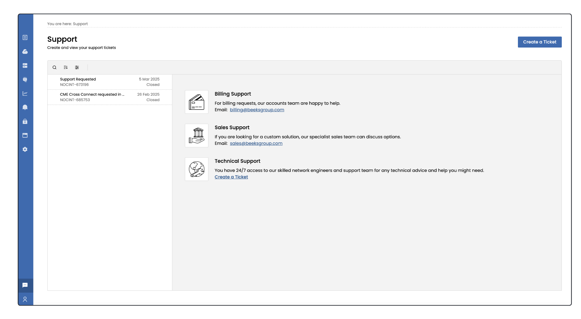 Select Support > Support Tickets in the main menu to display a listing of all tickets raised by your team and some shortcuts for contacting the appropriate Sales and Billing contacts.