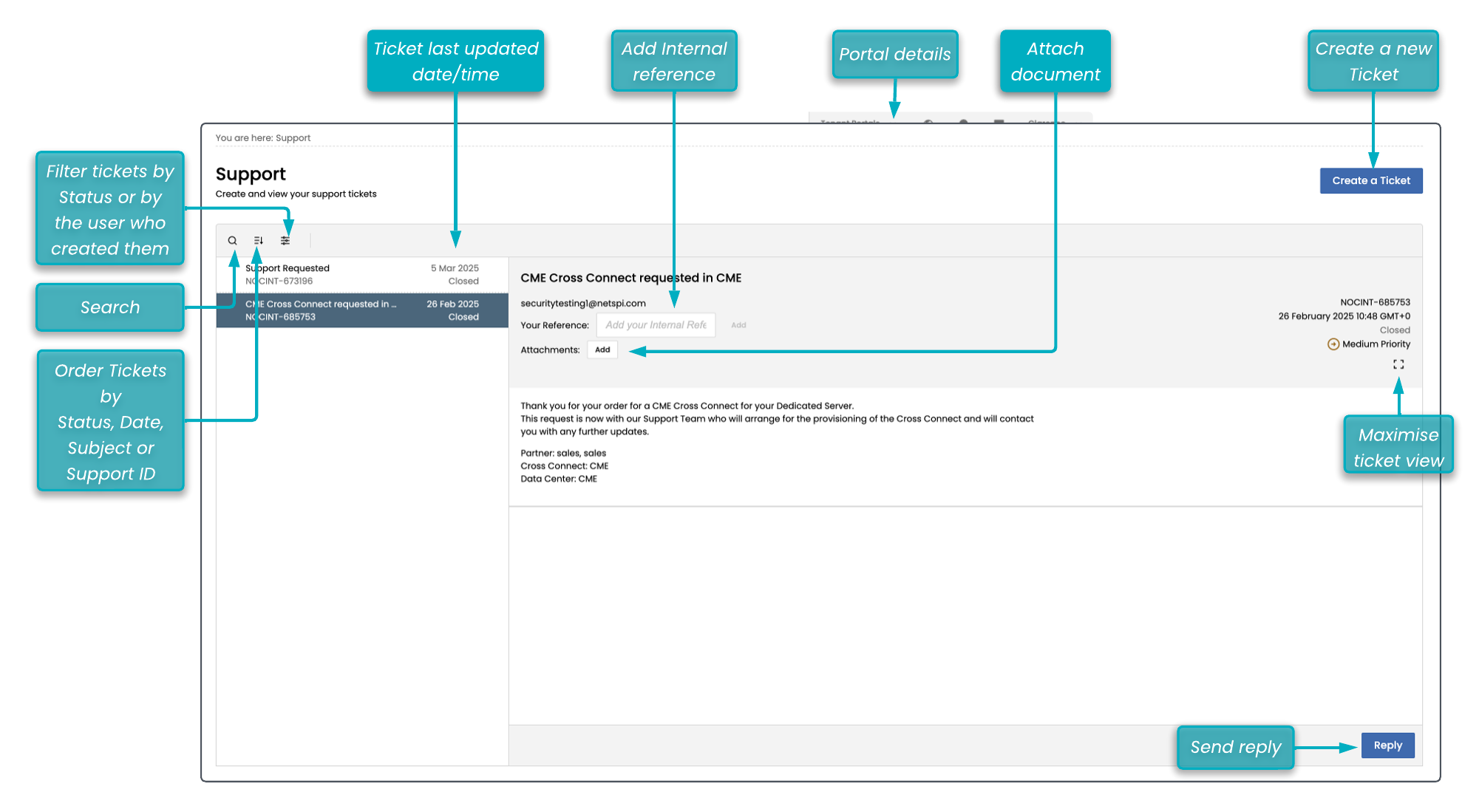 select an existing ticket from the listing to read it and provide more information, e.g., attach a document, add an internal reference, Send a reply, or close the ticket.