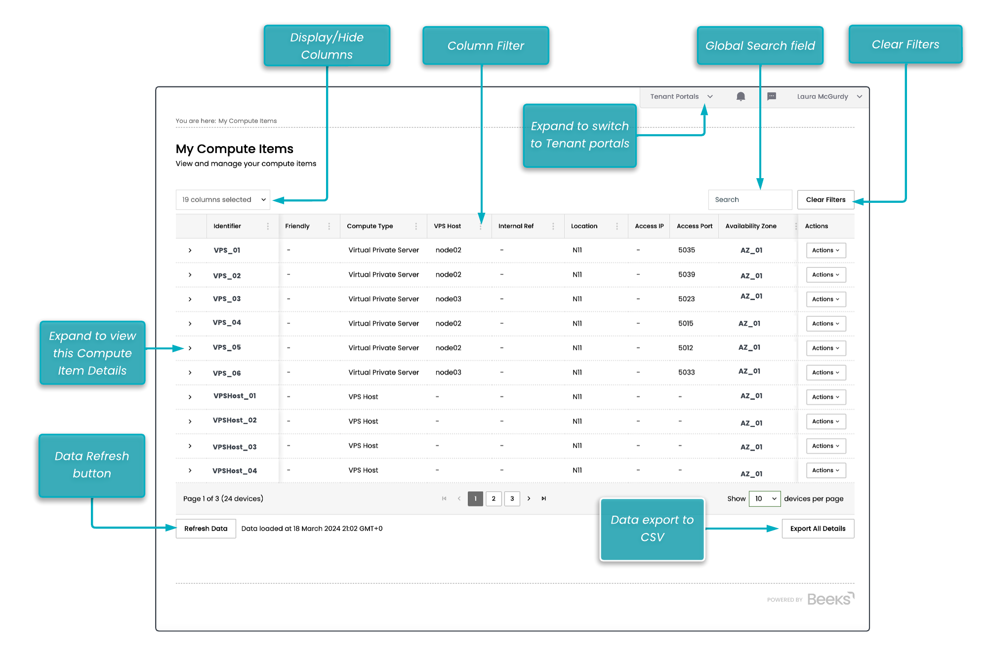 My Compute Items is the first page you see when you login into your Portal. It displays details of your compute. On this page, you can view more information about each of your compute items, perform actions on them, and export your entire inventory as a spreadsheet (.csv).